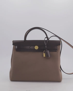 Hermès Herbag 31 Zip Bag in Etoupe Toile Canvas, Fauve Vache Hunter Leather with Gold Hardware