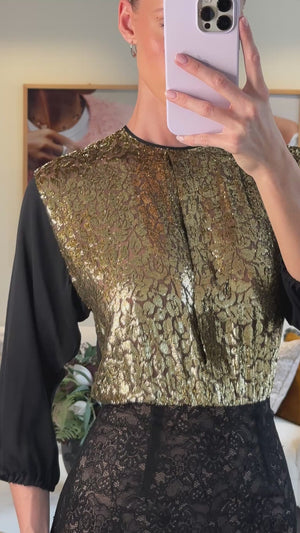 Alessandra Rich Black Gold Metallic Long Sleeve Gown with Lace Detail Size M (UK 10)