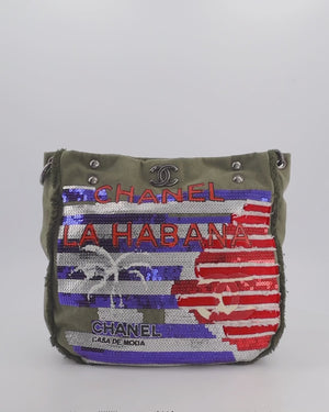 Chanel Khaki Canvas La Habana Casa de Moda Silver, Navy and Red Sequin Embellished Tote Bag