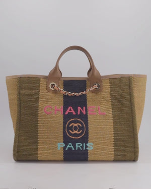 *HOT* Chanel Beige, Navy and Khaki Raffia Deauville Tote with Pastel Logo and Champagne Gold Hardware