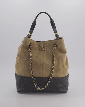 Chanel 25A Brown Suede Black Shiny Calfskin Coco Shopping Hobo Bag with Brushed Gold Hardware