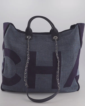 Chanel Denim Blue Logo Maxi Deauville Chain Tote Bag with Silver Hardware