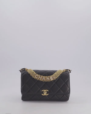 Chanel Black Flap Bag in Lambskin Leather with Crystal Chanel Logo and Gold Hardware