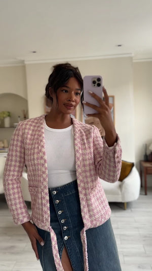 Chanel Cream and Pink Houndstooth Tweed Jacket with Tie Waist Size FR 40 (UK 12)