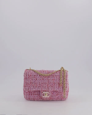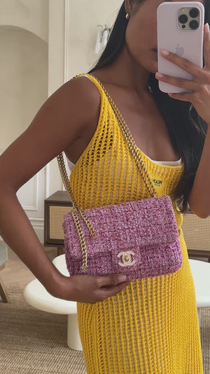 Chanel Pink & Lilac Tweed Seasonal Single Flap Bag with Brushed Gold Hardware & Pink CC Logo