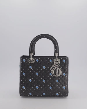 Christian Dior Medium Lady Dior Bag in Black Calfskin with Blue Floral Embroidery and Silver Hardware