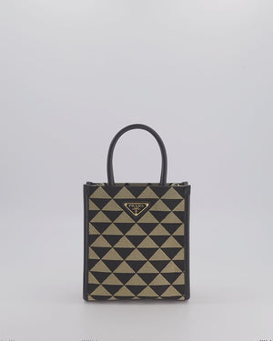 Prada Symbole Patterned Jacquard Mini Tote Bag In Black and Beige with Gold Hardware