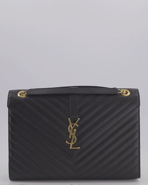 Saint Laurent Black Envelope Shoulder Bag in Grained Calfskin Leather with Gold Hardware