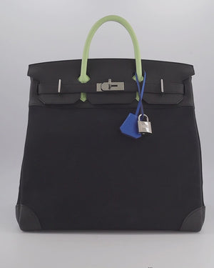 Hermès Haut à Courroies HAC 40 Bag in Noir Toile Canvas and Togo Leather with Vert Absinthe Handles, Blue Hydra Clochette, and Palladium Hardware
